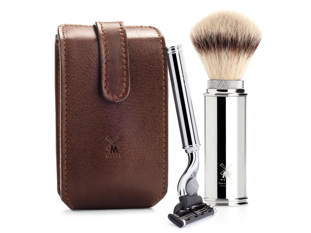 Bez chromu by svět přišel o hodně svého lesku! Velice funkční a lehká cestovní sada na holení Mühle v provedení z chromovaného kovu. Sada obsahuje kvalitní jemnou štětku ze speciálně vyvinutého syntetického vlákna Silvertip Fibre (100% veganský původ) a holicí strojek na hlavice Gillette Mach3. Zašroubovatelná hlava štětky na holení je dokonale chráněna při cestách a přitom štětka splňuje i ergonomické požadavky a garantuje pevné uchopení. Speciální odolné chromování demonstruje ty nejlepší vlastnosti chromu spolu s velmi dlouhou životností a luxusním vyzývavým leskem. Součástí sady je i kvalitní ručně vyrobené kožené pouzdro ve Florentském stylu.