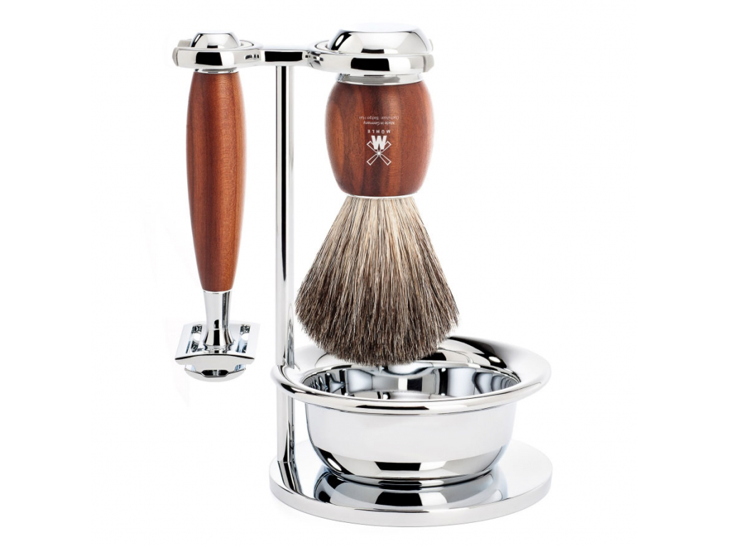 Německá kvalita za skvělou cenu, to jsou charakteristické znaky této sady na holení Mühle. Sada obsahuje kvalitní jemnou štětku z jezevčích štětin Pure badger a holicí strojek na klasické žiletky. Sada na holení je v klasickém mírně baňatém tvaru, který uspokojí nejen estetické, ale i ergonomické požadavky a garantuje pevné uchopení. Sada je v provedení z výběrového švestkového dřeva "Plum wood" a kovových částí s krásným odolným chromováním. Součástí sady je i kovový chromovaný stojánek s miskou.