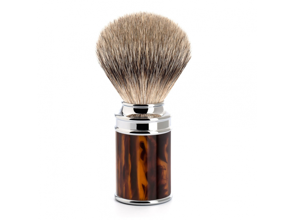 Bez chromu by svět přišel o hodně svého lesku. Tradiční a krásná štětka na holení Mühle z chromovaného kovu a nejlepších jezevčích štětin na světě. Štětku na holení vystihuje krásný design v provedení z velice odolné, syntetické pryskyřice v designu želvoviny. Speciální odolné chromování demonstruje ty nejlepší vlastnosti chromu spolu s velmi dlouhou životností a luxusním vyzývavým leskem.